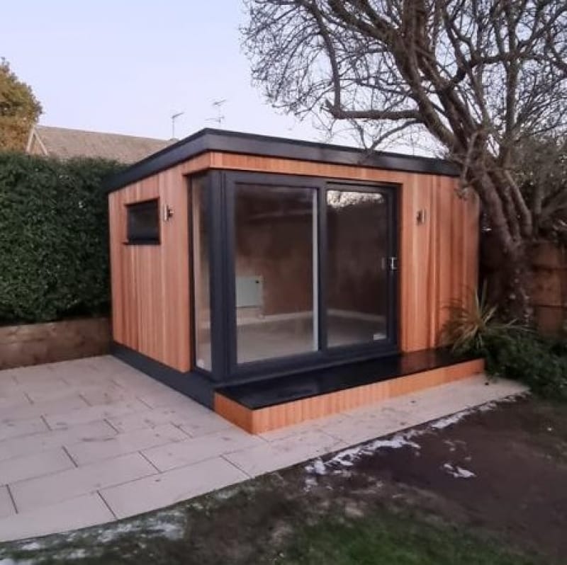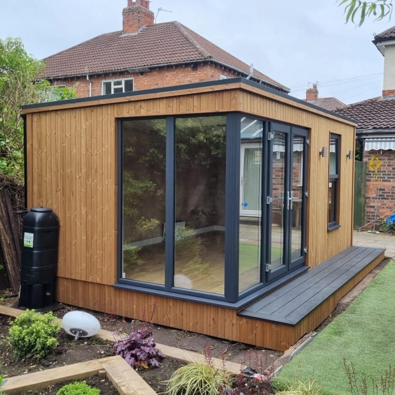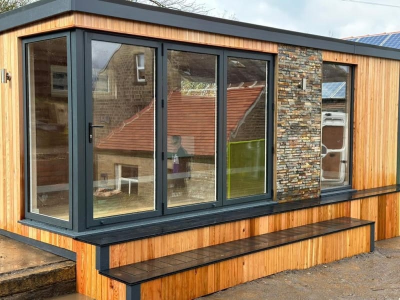 Each Edge Garden Room is supplied with a dark grey (anthracite) PVCu 2.4m sliding door section, aluminium corner post, full height fixed glass window panel and a wide-opening window. Double glazing and insurance-approved locking systems are included as standard, delivering security, natural light, and ease of access.