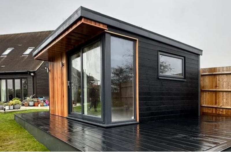 The Extend Edge Garden Room - a practical, modern design that combines a glass corner feature with a 0.5m roof canopy running across the full front of the building, bringing light, shelter, and a strong connection to the outdoors.